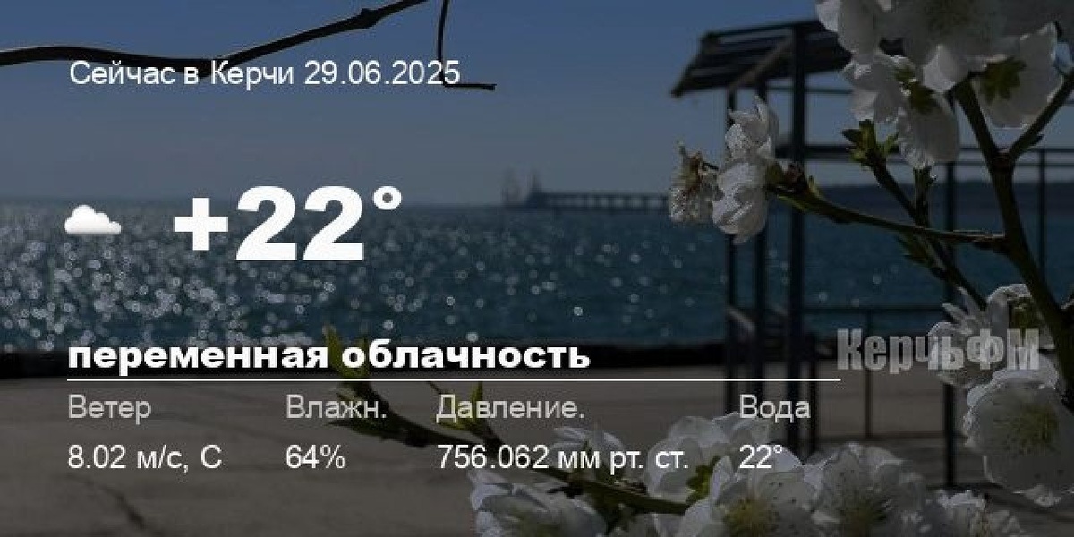 Сегодня днем в Керчи, 29 июня, ожидается небольшой дождь, температура воздуха от +17.7° до +22.2°С, ветер северный 7.34 м/с, порывы до 9.29 м/с, давление 756.1 мм рт. ст., влажность 65%.
