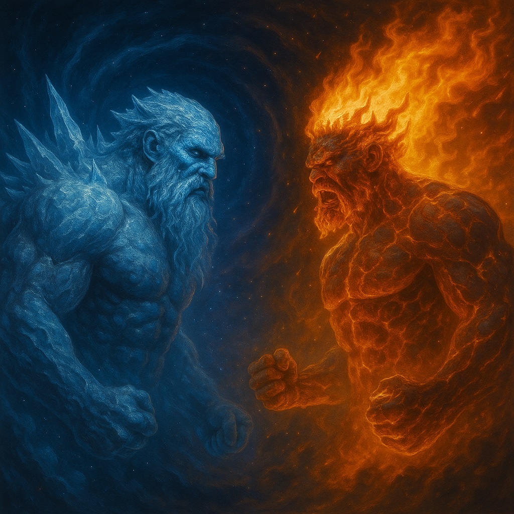 До того как первые слова вырвались из глоток богов, до того как люди придумали счёт времени, — во Вселенной простирался Гинунгагап, зияющая бездна без ветра и формы. С одной стороны бездны дышал Нифльхейм, тяжёлый, как промёрзшая смоль, с вязкой солью инея в каждом порыве. С другой — Муспельхейм, сверкал, словно пламя кузницы, где сам огонь точит лезвие собственной ярости. Здесь, на границе холода и жара, родились два пращура всего сущего: Юмир, ледяной исполин, и Сурт, владыка пламени. Они не дружили, не воевали — они существовали, как две несовместимых формулы, что вместе запускают реакцию. Но кто из них на самом деле владел первой печатью бытия?