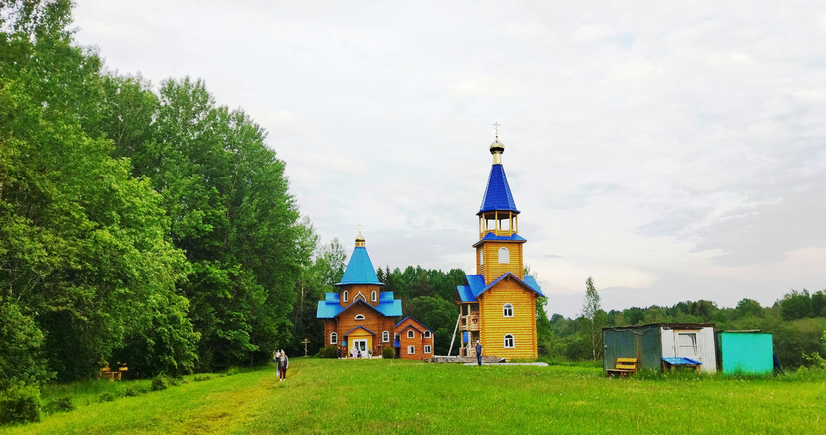 Церковное подворье лаконично – яркая сочная трава, высокое небо и густой лес. Эта Божия красота украшает любое строение рук человеческих, придает ему значимость и смысл.