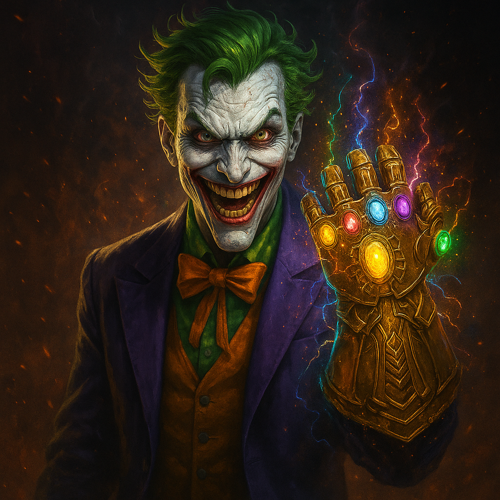 В бескрайней мультивселенной происходит немыслимое. После финальной битвы с Таносом, величайшие герои Marvel вздыхают с облегчением – баланс восстановлен. Однако в тени далёкой планеты кто-то чужой украдкой подбирается к золотой Перчатке, усеянной Камнями Бесконечности. Зловещий смех раздаётся во мраке: Джокер, величайший безумец Готэма, нашёл путь в другую вселенную и завладел силой богов. Он пробирается обратно через межреальность, сжимая трофей в побелевших пальцах – теперь хаос станет его оружием во всех мирах.