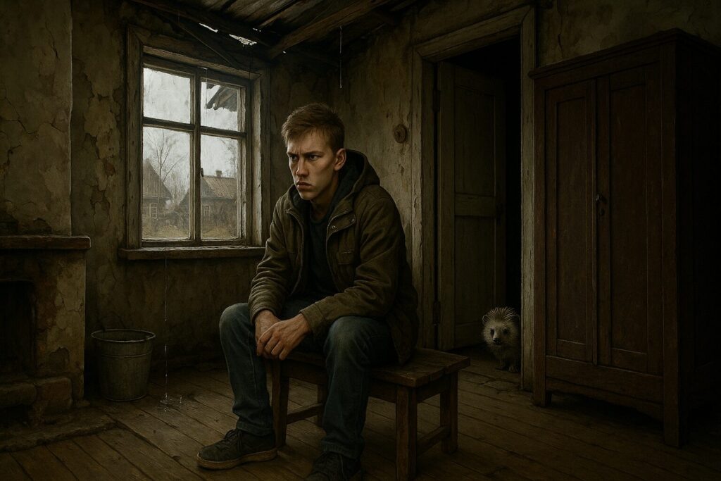 Домик стоял покосившийся, как пьяный дядя Вася после получки. Крыша текла, печка дымила, а в туалете типа «сортир» жила целая семья ежей. Причём ежи смотрели на Петьку так, будто это он к ним в гости незваный пришёл.