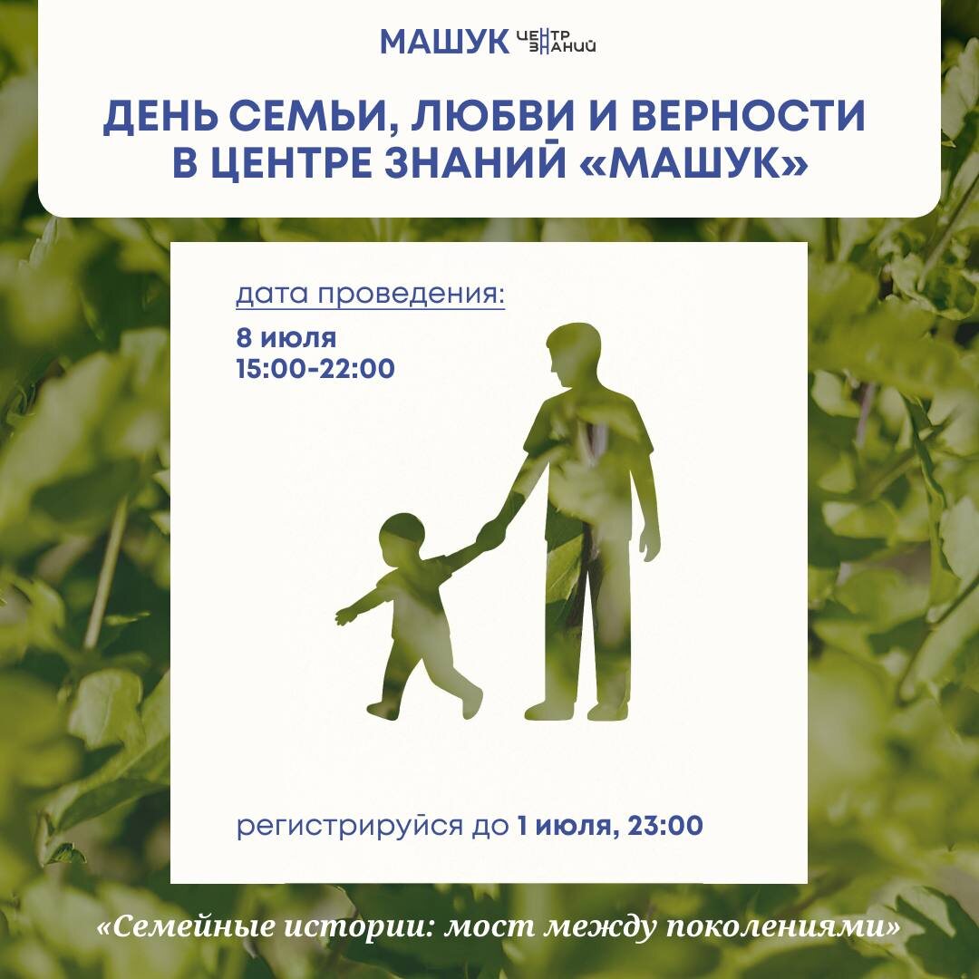 Центр знаний «Машук» приглашает провести День семьи, любви и верности вместе 💙 На однодневной программе «Семейные истории: мост между поколениями» вас будут ждать мастер-классы, лекции и творческие активности. Будем говорить о поиске пути и профессиональной навигации, поддержке в семье и вместе погружаться в сказочные сюжеты. К участию приглашаются 2 представителя семьи: дети (от 14 до 17 лет) в сопровождении старшего родственника. 📆 Дата: 8 июля, 15:00-22:00 ч. 📍Адрес: Центр знаний «Машук», город-курорт Пятигорск, ул. Пионерлагерная, 8в 📌Будем ждать ваши заявки по ссылке до 1 июля, 23:00, чтобы провести этот светлый праздник с пользой для всей семьи! Важно: в рамках однодневной программы проживание не предоставляется.