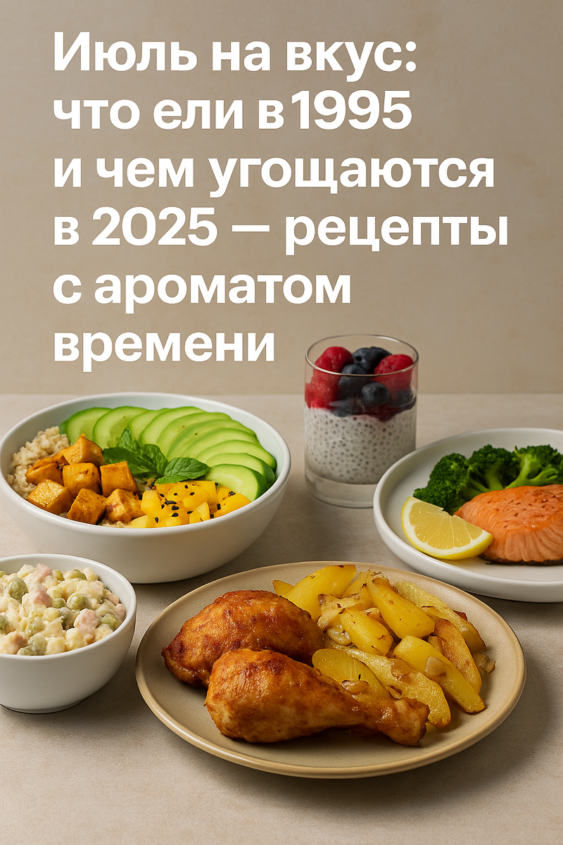 Время меняет всё — от моды и технологий до того, что мы ставим на обеденный стол. Июль 1995 года пах зелёным горошком из банки, ароматной жареной курицей и сладким мороженым из ближайшего гастронома. А июль 2025 — это лёгкие боулы, кето-десерты и умные духовки, делающие половину работы за нас.