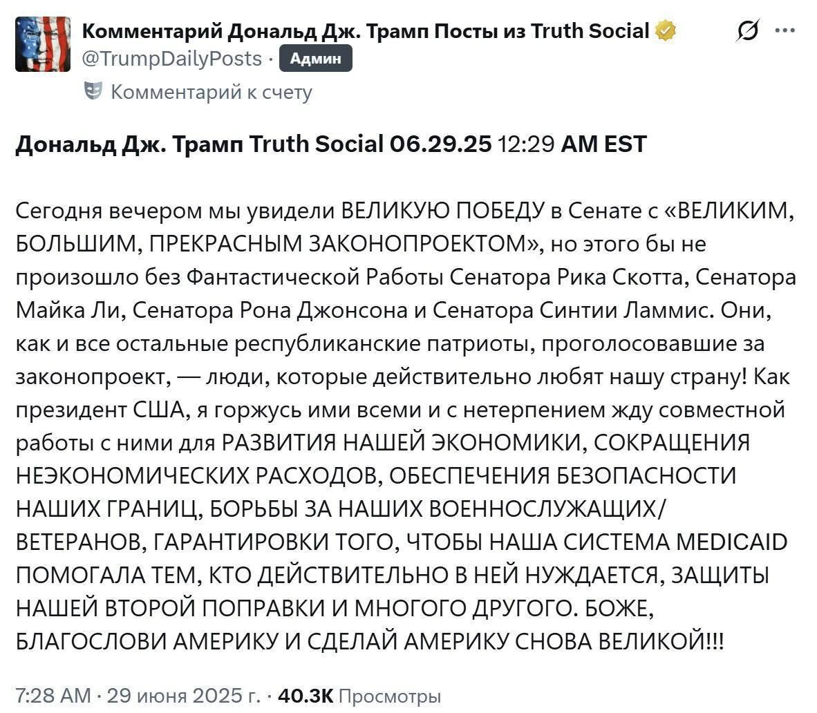 🇺🇸«Большой и Прекрасный Закон» Трампа Почти Подписан Конгресс вот-вот утвердит законопроект о снижении налогов, который официально называется «Один Большой и Прекрасный Закон». Как обещает Трамп, в результате американцы заживут привольно, а США ждет невиданный экономический бум. Трамп торопит подконтрольный ему Сенат принять закон до Дня независимости 4 июля. ⚠️Однако экономисты и даже соратники Трампа предупреждают, что его большой и прекрасный закон еще больше раздует гигантский госдолг и дефицит бюджета США, сократит доходы населения и бизнеса, уронит курс доллара и подорвет влияние Америки в мире. 🗣Илон Маск заявил, что «Большой и Прекрасный Закон» президента Трампа уничтожит миллионы рабочих мест и нанесет вред США