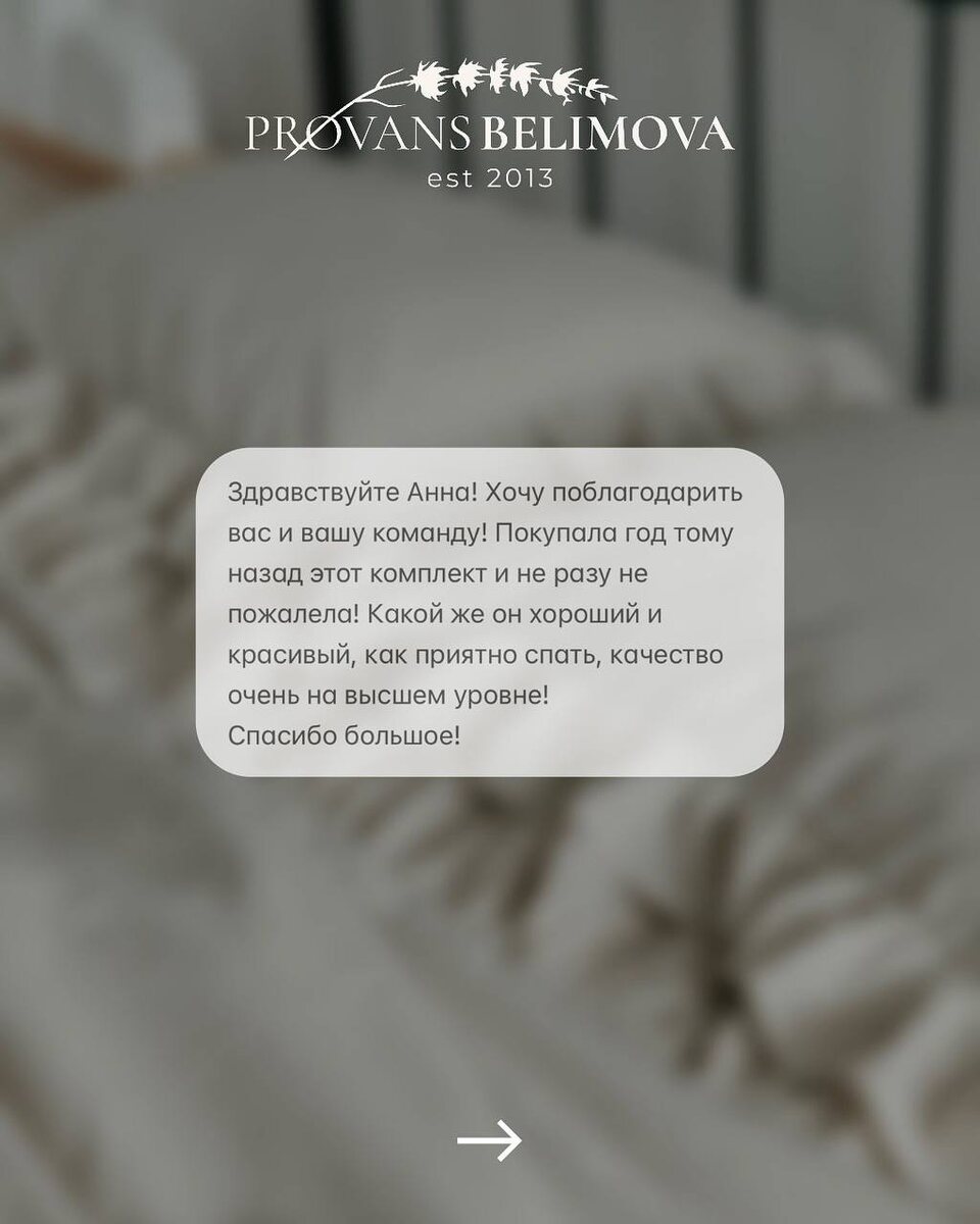 Мы бережно храним ваши отзывы — они помогают нам становиться лучше, создавать ещё более уютные и душевные вещи. Расскажите, как воланы и мягкий лён поселились в вашей спальне, что чувствуете, засыпая в этих простынях, какие мечты снятся на таких наволочках.