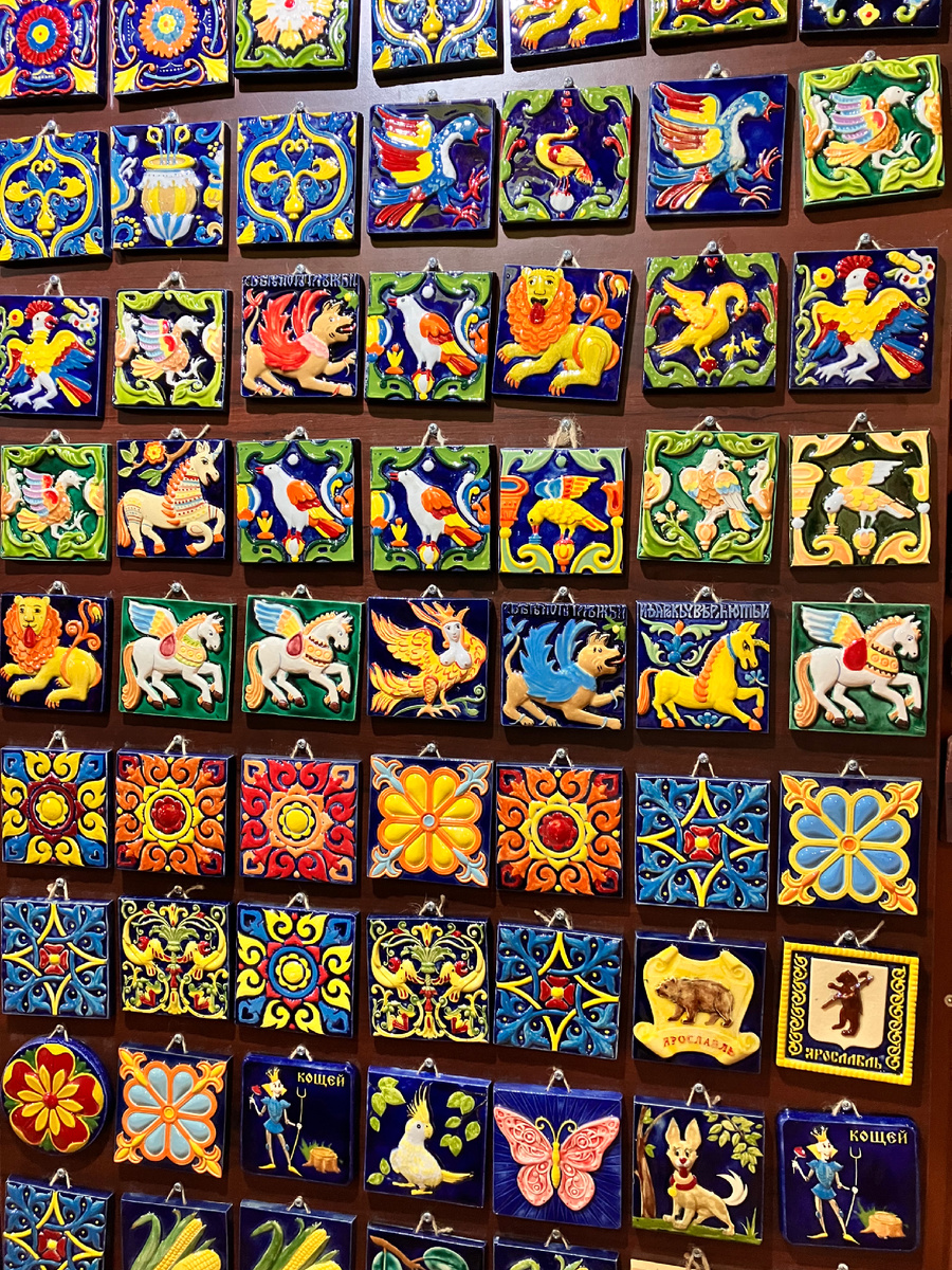… Не удержалась. Сейчас расскажу, что интересного я привезла из Ярославля, ведь речь идет не о банальных магнитах и брелоках, а действительно уникальных вещицах. Керамические плитки, которыми украшали церкви Ярославля несколько веков назад, теперь являются изюминкой сувенирной продукции Ярославля. Яркие, самобытные плитки ручной работы станут оригинальным декором стен, камина или даже холодильника в виде магнита. Изделия из керамики, покрытые глазурью, на которую наносят рисунок, а затем отправляют в печь на обжиг. Майолику в Ярославле изготавливают с XVIII века. Ими украшали дома и церкви. Красивые панно и фигурки можно подобрать на свой вкус и в интерьер любой квартиры. — техника создания украшений из эмали и серебра. В основном это украшения: кулоны, кольца, серьги и тому подобное. Что-то подобное хранилось в маминой шкатулке. Завод по изготовлению финифти находится в Ростове Великом, но и в Ярославле выбор изделий огромен. Колечко из финифти уникально и красиво будет смотреться на