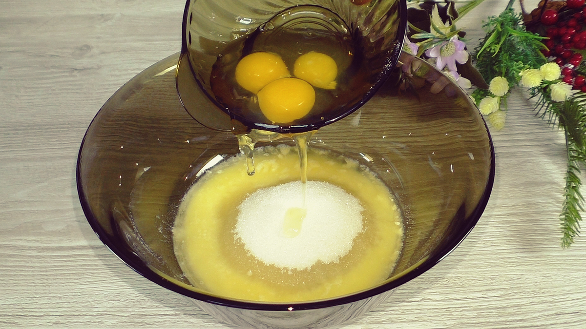 К маслу добавить щепотку соли, сахар, яйца, перемешать. По желанию можно добавить ванилин или ванильный сахар, я сегодня не добавляла.
