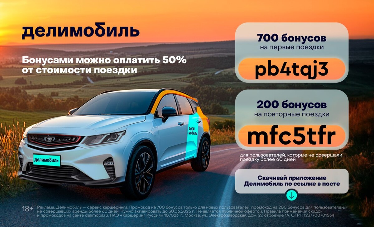 Синоптики обещают, что лето будет аномально жарким, но это не повод запираться дома. Погода не помешает планам, если в путешествие вы отправитесь на машине с кондиционером! Например, можно арендовать автомобиль в сервисе Делимобиль на несколько дней и поехать в небольшой тур в другой город. Так вы будете быстро и комфортно передвигаться между достопримечательностями, а еще получите бонус 😍 Забирайте промокод на: 🚙 pb4tqj3 – 700 бонусов на первые поездки 🚙 mfc5tfr – 200 бонусов для пользователей, которые не пользовались сервисом более 60 дней. Бонусами можно оплатить до 50% стоимости аренды автомобиля. Переходите по ссылке Реклама. ПАО «Каршеринг Руссия» 107023, г. Москва, ул. Электрозаводская, дом 27, строение 1А. ИНН 9718236471 ОГРН 1237700701534