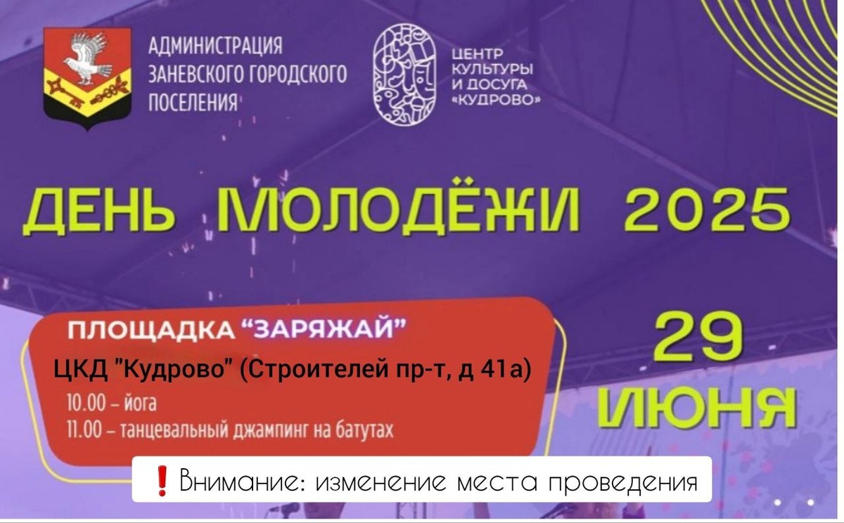 ❗️В связи с погодными условиями, площадка "Заряжай" в рамках празднования "Дня молодежи" переносится в помещения Центра культуры и досуга "Кудрово". Занятия йогой и джампингом пройдут по адресу: Строителей пр-т, д 41а. Возьмите с собой сменную обувь и хорошее настроение!💫 👋 Мы также приглашаем Вас на образовательную часть Программы в уютное пространство "Домик" и концертную часть в МЕГА Парк🥳 Пресс-служба Заневки 🌇 Жизнь в Кудрово Есть новости? Пишите сюда.