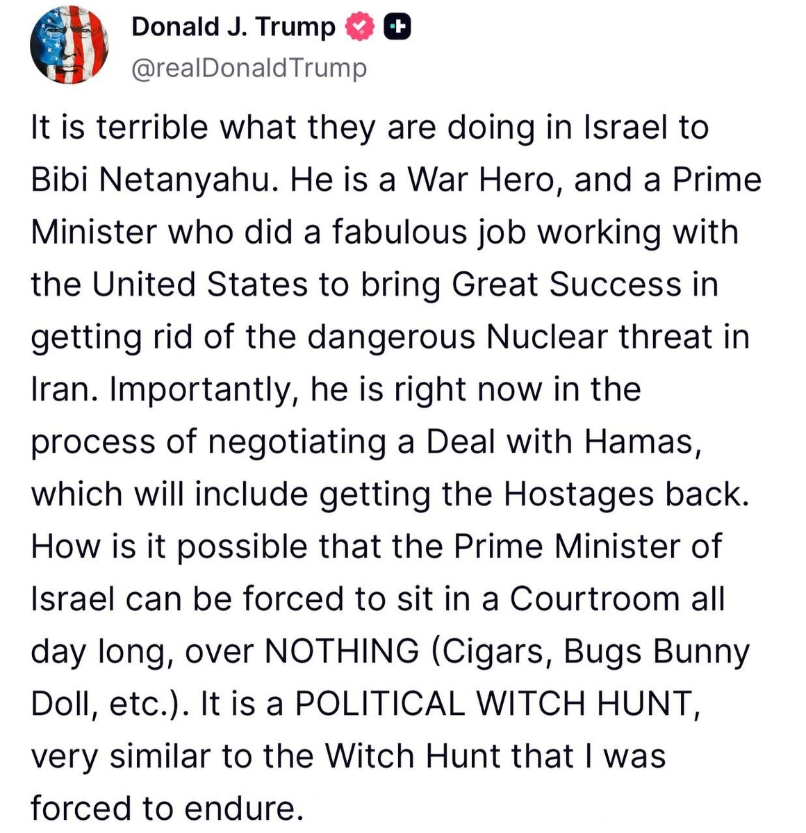 Трамп вписывается за Нетаньяху "Ужасно то, что они делают в Израиле с Биби Нетаньяху. Он Герой войны и премьер-министр, который проделал потрясающую работу, работая с США, чтобы добиться большого успеха в избавлении от опасной ядерной угрозы в Иране. Важно то, что он прямо сейчас находится в процессе переговоров о соглашении с ХАМАС, которое будет включать возвращение заложников. Как это возможно, что премьер-министра Израиля могут заставить сидеть в зале суда целый день, ни из-за чего (сигары, кукла Багз Банни и т. д.)? Это политическая охота на ведьм, очень похожая на охоту на ведьм, которую мне пришлось пережить. Эта пародия на «правосудие» помешает переговорам как с Ираном, так и с ХАМАС. Другими словами, это безумие делать то, что вышедшие из-под контроля прокуроры делают с Биби Нетаньяху. Соединенные Штаты Америки тратят миллиарды долларов в год, гораздо больше, чем на любую другую страну, на защиту и поддержку Израиля. Мы не собираемся это терпеть. Мы только что одержали вели