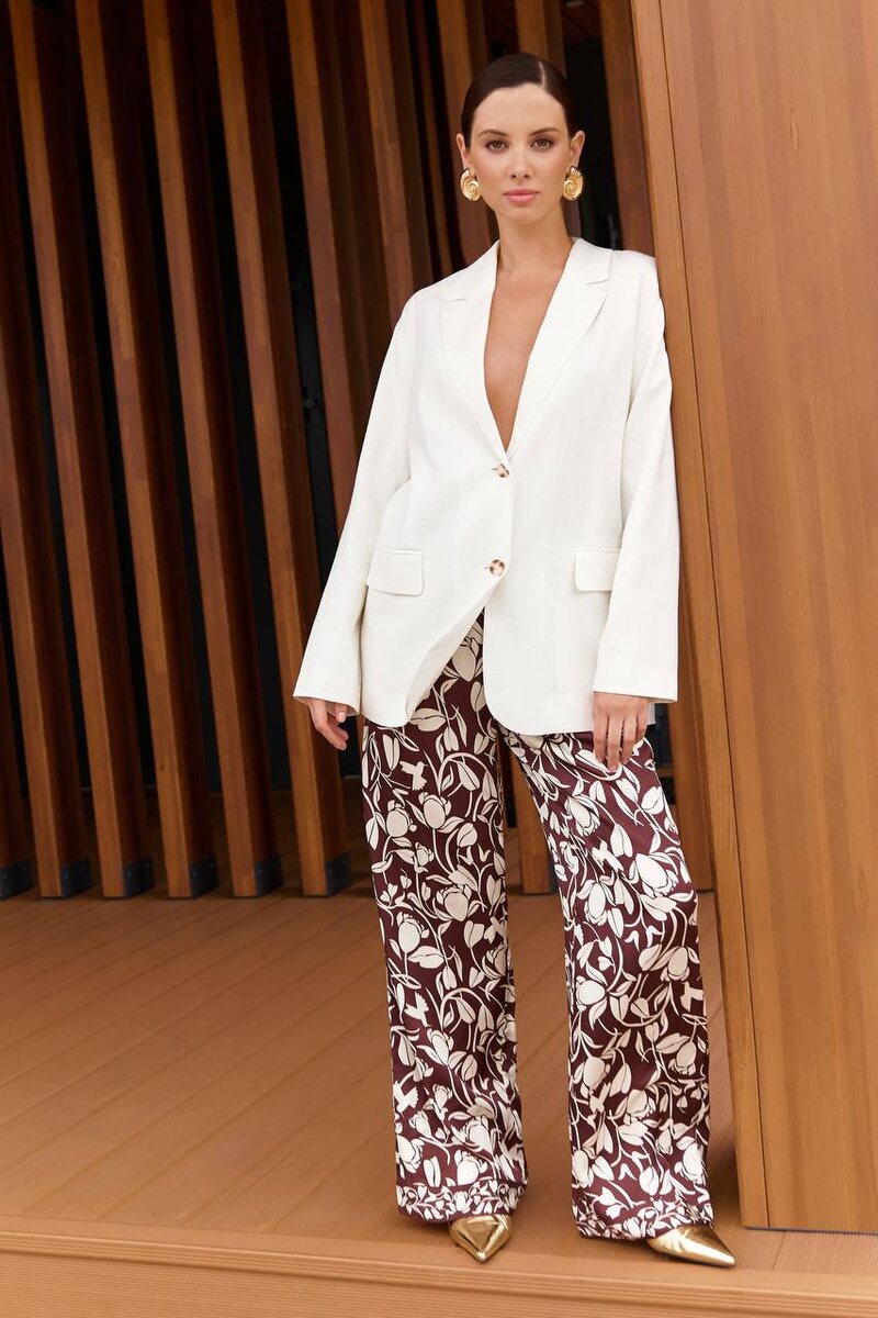 Летний образ, который идеально вписывается в настроение июня. Жакет из смесового льна — лёгкий, но держит форму. А сатиновые брюки с графичным цветочным принтом добавляют характер и движение. Носите с остроносыми мюлями или сандалиями.