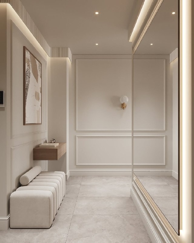 – Перед вами элегантный интерьер, сочетающий в себе латунь, дерево и яркие акценты в каждом пространстве. Дизайн-проект был разработан для семьи, состоящей из 5 человек : родители и трое детей. У каждого члена семьи есть отдельная комната, два санузла, гардеробные, постирочная и кухня-гостиная. Рассмотрим ключевые аспекты пространства, обращая внимание на принципы, воплощенные в его дизайнерском оснащении. На первой картинке расположена прихожая, выполненная в нейтральных бежевых тонах, свойственных современному стилю. Мягкая банкетка, гладкие стены и зеркальные элементы добавляют комфорта и визуального пространства, а картина на стене и подсветка зеркал – стиля и индивидуальности. Функционально прихожая просторна: свободная планировка, достигнутая минимализмом и зеркальной пространностью, обеспечивает легкий проход. Кухня-столовая оптимизирует приготовление и прием пищи, располагая кухонный гарнитур вдоль стены и обеденный стол в центре столовой зоны. Светильники создают достаточное