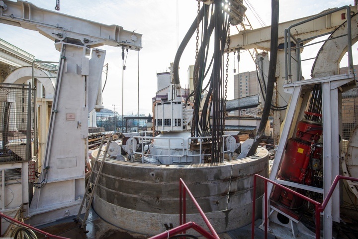 На снимке — «сердце» будущей станции: огромный цилиндр шахтного ствола, собранный из серых чугунных тюбингов. Пучки чёрных кабелей и гидрошлангов свисают, будто щупальца глубоководного осьминога. Две белые портальные стойки держат талевые блоки, через которые рабочие спускают вовнутрь секции кольца. На заднем плане — башенные краны и панорама Садового кольца. Всё это — площадка пятого ствола, который метростроевцы проходятся «горным» способом: вниз по мере роста кольцевой обделки.