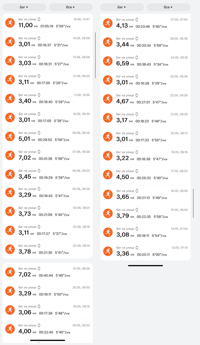 Вот что могу сказать: максимум 8 пробежек прошли на подъёме духа. В их числе мой последний забег на 11 километров — он был реально крутым. Но про него расскажу позже.