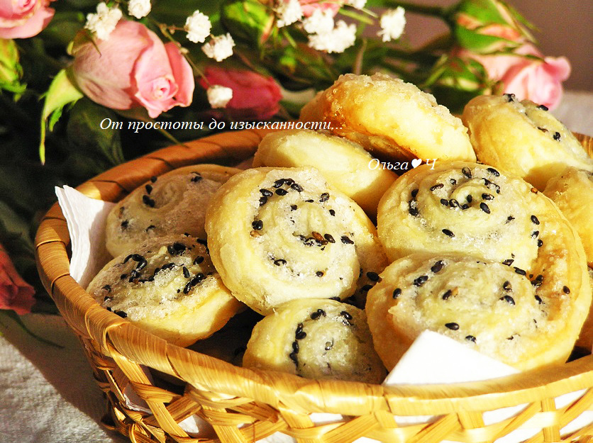 2-3 ст. л. черного обжаренного кунжута Приготовление: Слоеное тесто раскатайте, посыпьте сахаром и кунжутом. Сверните тесто с одной стороны до середины. Затем с другой стороны до середины. Нарежьте кусочками толщиной 1-1,5 см. Разверните заготовки, переложите на противень, застеленный пекарской бумагой. Выпекайте при 200*С около 20-25 минут до румяности. Остудите и подавайте к столу. Приятного аппетита! Вам также могут понравиться: