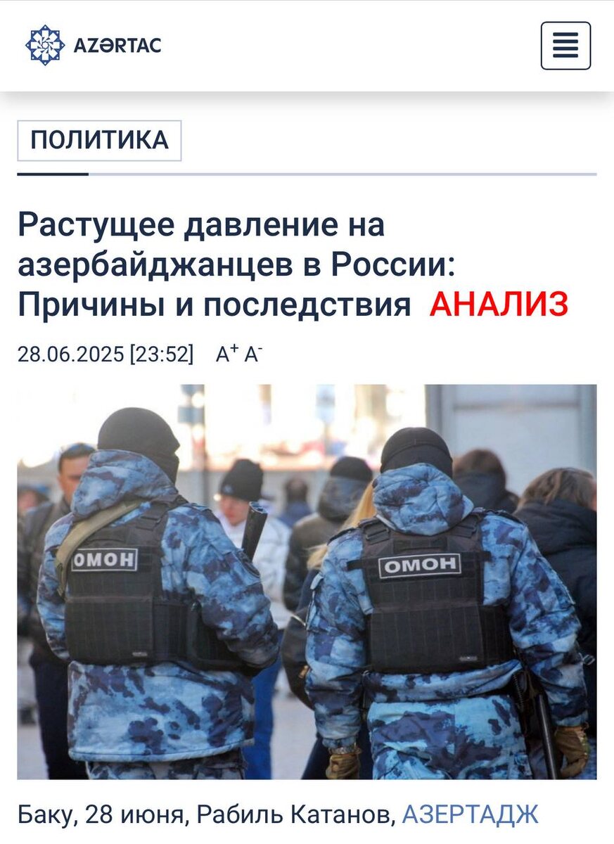 🇦🇿🇷🇺 Тезисы из статьи в национальном информационном агентстве Азербайджана (как у нас ТАСС), написанной после задержания бандитов в Екатеринбурге. Иными словами, «голос государства» говорит следующее: «Внутренняя политика, проводимая сегодня в России, напоминает Германию 1930-х годов. «Тотальная пропаганда» и «тотальный контроль»; «Война (на Украине) продолжается уже 4-й год, и видимых побед России, кроме уничтожения украинских городов, до сих пор не видно. Украина, получающая существенную поддержку с Запада, хорошо защищена, и война затягивается, что ведет экономику и человеческие ресурсы России к разрушению»; Ну и там еще очень много мерзости. Вместо того, чтобы сотрудничать с Москвой по линии правопорядка, вот это. Мда.