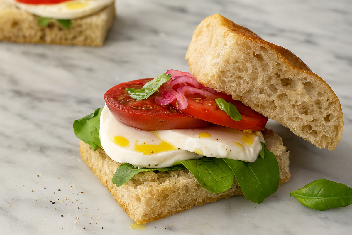 Этот сэндвич с томатами, моцареллой и базиликом — классика, которая не надоедает. Он собирается за 15 минут, не требует готовки и каждый раз получается по-летнему ярким. Всё, что нужно — хорошие помидоры, свежая моцарелла, зелень и кусок ароматного хлеба. Нарежьте фокаччу или другой хлеб пополам. Выложите на нижнюю часть листы рукколы. Сверху разложите ломтики свежей моцареллы и нарезанные кольцами или полукольцами помидоры. По желанию добавьте вяленые томаты и немного маринованного лука. Положите сверху свежие листья базилика. Сбрызните начинку оливковым маслом, приправьте солью и перцем. Накройте второй половиной хлеба. Сэндвич готов к подаче или упаковке. Сэндвич Капрезе хорош сам по себе, но особенно удачно сочетается с лёгкими закусками: нарезанными овощами, хумусом, овощными салатами, солёными чипсами или сезонными фруктами. Это отличный вариант для обеда на природе или лёгкого ужина. Сэндвич Капрезе — это пример того, как из простых сезонных продуктов можно собрать полноценное