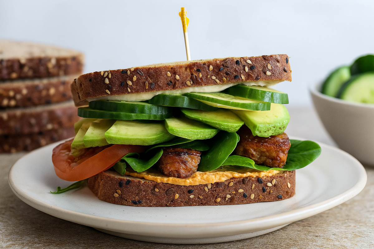 Когда хочется чего-то вкусного, сытного и абсолютно растительного, этот клубный сэндвич — идеальный вариант. Основа — золотисто обжаренные полоски темпе в ароматном маринаде с копчёной паприкой и кумином. Вместо привычного майонеза — два вида намазки: из белой фасоли с лимоном и чесноком, а также её вариация с вялеными томатами. Добавим немного свежих овощей, и обед, который впечатлит даже любителей мяса, готов. Для сэндвича: Для намазки из белой фасоли: Для томатной намазки: Приготовьте фасолевую намазку.