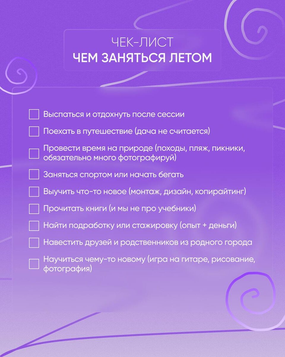 Будем радовать тебя контентом с идеями где и как отдохнуть и развлечься, а пока сохраняй чек-лист и отмечай, чем займёшься на каникулах ☀️