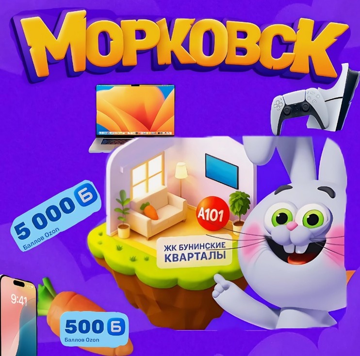 «Морковск» - это новая акция от Ozon, в рамках которой вы можете накапливать морковки и выиграть квартиру в Москве и другие ценные призы. В числе моментальных призов вы получите промокоды, предоставляющие скидку 90% на покупку различных товаров. В акции участвуют 20 наушников Apple AirPods, 20 часов Apple Watch, 20 Яндекс Станций Мини 3, а также 5 смартфонов Apple iPhone 16. Кроме того, вы можете выиграть 15, 50, 100 или 150 Баллов Ozon, 50, 100 или 150 ВАУ-баллов Ozon, морковку и другие промокоды и скидки. Также в числе призов присутствуют 11 смартфонов Apple iPhone 16 с промокодом на 99,9% скидку, 20 наушников Apple AirPods (99,9%), 15 Яндекс Станций Мини 3 (99,9%), 15 часов Apple Watch (99,9%), 5 ноутбуков Apple MacBook (99,9%), 15 игровых консолей Play Station 5 (99,9%) и 15 стайлеров Dyson (99,9%). В дополнение, для участников доступны промокоды на 500 Баллов Ozon (5000 шт.), на 1000 Баллов Ozon (1000 шт.), на 3000 Баллов Ozon (300 шт.) и на 5000 Баллов Ozon (100 шт.). Главный суп