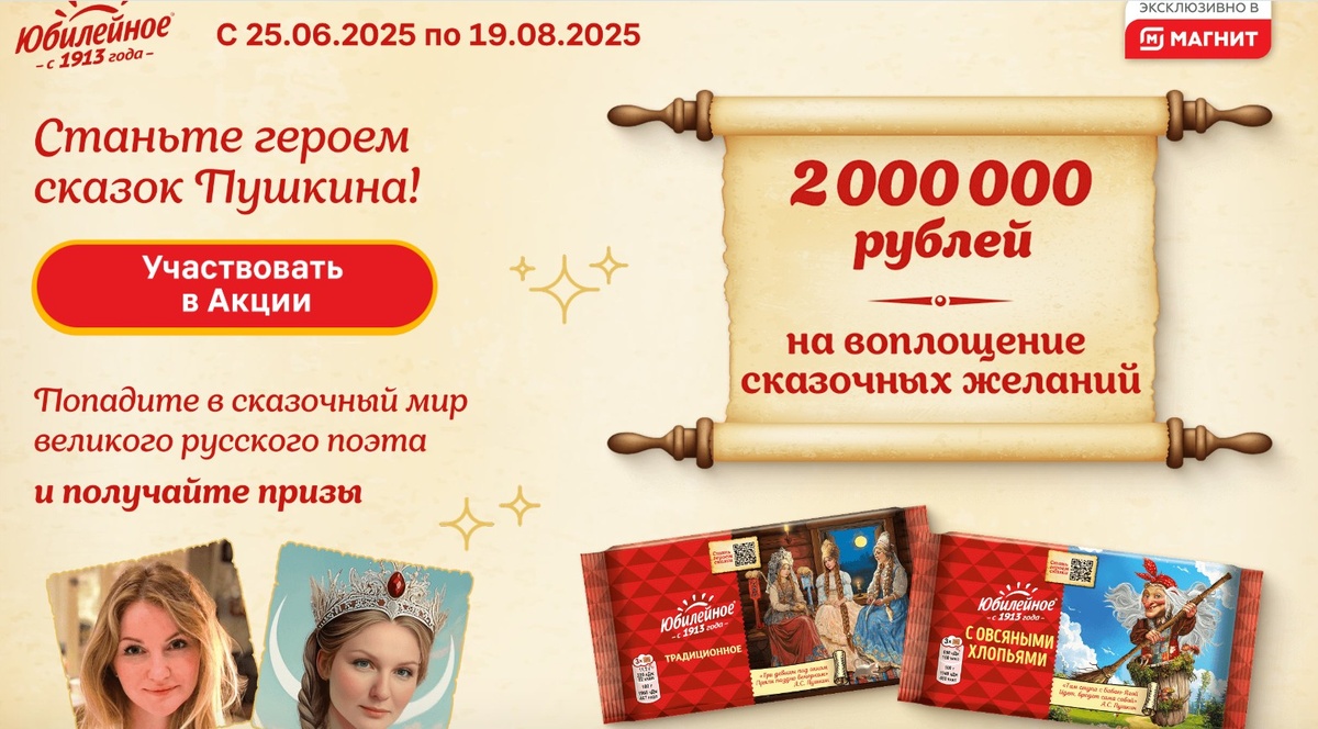 В июне 2025 года сеть магазинов «Магнит» запустила отличную акцию с печеньем «Юбилейное» в лимитированном дизайне сказок Пушкина. Акция предлагает множество подарков и призов: гарантированных, еженедельных, а также главный приз — 2000000 рублей! Каждый участник получает гарантированный приз: электронный купон, позволяющий купить упаковку «Юбилейного» всего за 1 рубль — таких купонов 30000 штук. А среди еженедельных призов разыгрываются, к примеру, 500 бонусов на карту Магнит Плюс, сертификаты на покупки в магазинах «Магнит Косметик», «Спортмастер», «Читай-Город», «Hoff», «М.Видео». Также в розыгрыше участвуют ноутбуки, наушники и смартфоны. Для участия в этой акции нужно всего лишь подтвердить свое желание поучаствовать с 25 июня по 19 августа 2025 года и купить хотя бы одну упаковку продукции под брендом «Юбилейное» с применением бонусной карты. Акция проводится в магазинах торговой сети «Магнит» в форматах «Магнит у дома», «Магнит Семейный», «Магнит Экстра», «Магнит Опт». Полные прав