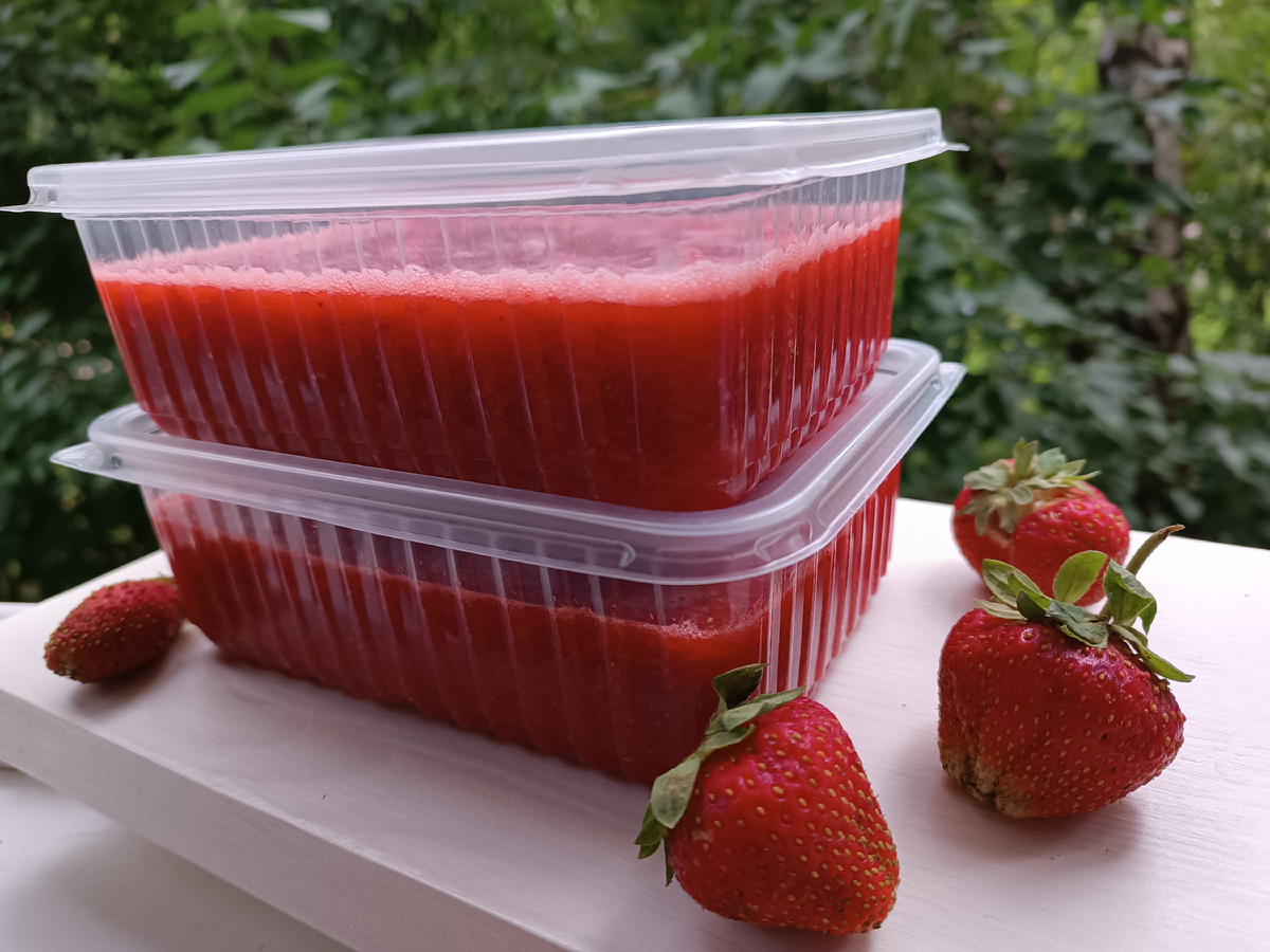 Когда клубникой уже наелись,можно и заготовочки на зиму поделать. Клубничного варенья стала варить совсем мало,обычно основную часть клубники перетираю и замораживаю,мы так больше любим. После разморозки остаётся такая же свежая на вкус и хорошо дополняет блинчики,оладушки или просто кушать ложкой. Клубника Сахар - по вкусу. Блендер Контейнеры - для заморозки. Я люблю когда в клубничном пюре попадаются кусочки,поэтому блендерю на низкой скорости,чтоб не все ягоды превращались в пюре. Иногда оставляю небольшую часть клубники и нарезаю на кусочки( это когда не лень)отправляю в пюре. Насыпаем сахар по вкусу, перемешиваем и оставляем на 1 час при комнатной температуре до растворения сахара. Далее перемешиваем и разливаем по лоткам,отправляем в морозилку. Зимой достаем и наслаждаемся вкусом свежей клубники!❤️
