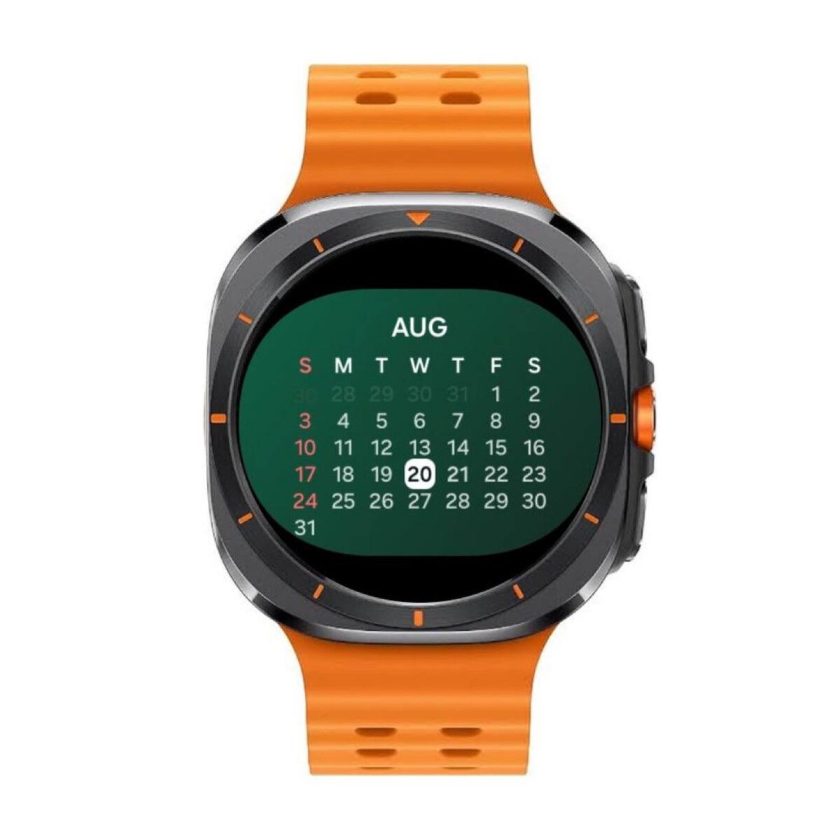 Это часы с интерфейсом Календаря в форме таблетки на круглом экране в квадратном корпусе.