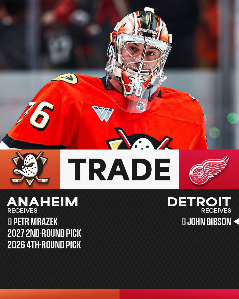 🚘 Джон Гибсон перешёл в «Детройт» в результате обмена. В обратную сторону проследовал Петр Мразек, пик второго раунда 2027 года, пик четвёртого раунда 2026 года.