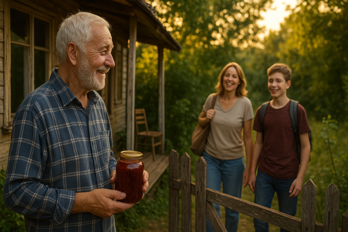 Старый дачный посёлок начинал оживать с приходом лета. За городом, среди вишнёвых и яблоневых садов, стоял облупившийся деревянный домик с резной верандой, скрипучим полом и запахом времени — смесью старой краски, пыли, трав и яблок. Каждый уголок этого места был пропитан воспоминаниями, каждое дерево знало свою историю. Здесь, как заведено уже десятилетиями, Виктор Павлович проводил каждое лето. Шестьдесят восемь лет, вдовец, бывший инженер. Молчаливый, сдержанный, но внутри — мягкий, как пух с одуванчика, если только приглядеться повнимательнее. В этом году он снова приехал один. Дочь Ирина не смогла — работа, дела, суета большого города. Внук Саша, увлечённый гаджетами, давно перестал проявлять интерес к даче. Виктор вздохнул, поставил дорожные сумки у порога, провёл ладонью по облупившейся краске двери и тихо, почти шепотом, произнёс: — Ну, здравствуй, дом. Он прошёлся по комнатам. Всё было на своих местах — словно жена только вчера вышла в сад. На стене фотографии: Ирина, совсем к