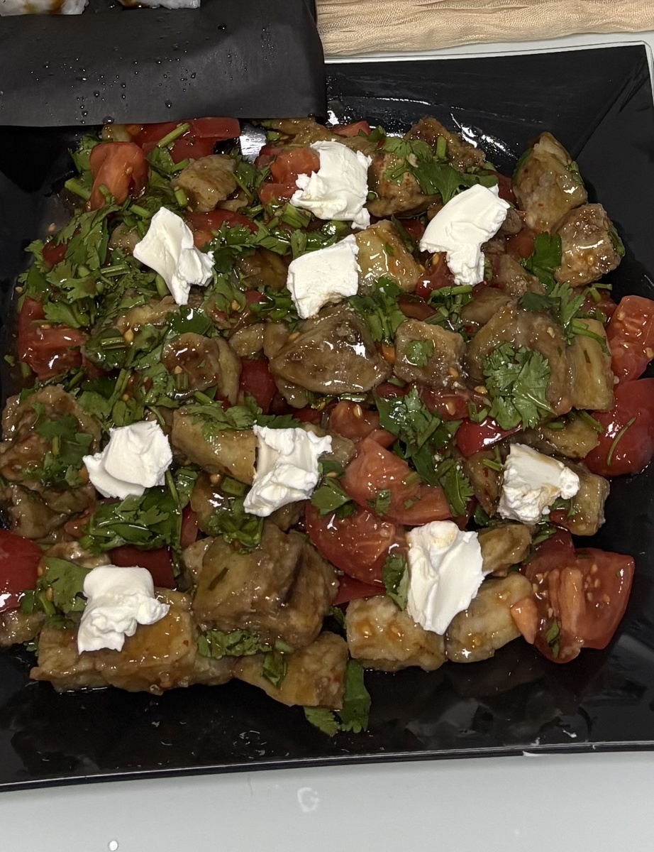 Список продуктов: 2-3 баклажана 4 помидора Кинза пучек 100 гр творожного сыра Остро- сладкий соус для заправки Капля соевого соуса по желанию! Р.S. Подруга не любит кинзу и заменяет её петрушкой, можно конечно, но кинза этому салату придаёт свою особенную фишку🤫
