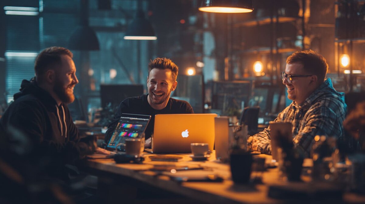 На столе — ноутбуки: один MacBook с чуть поцарапанным яблочком, другой — тяжёлый игровой монстр с подсветкой клавиш. Три человека сидят вокруг.