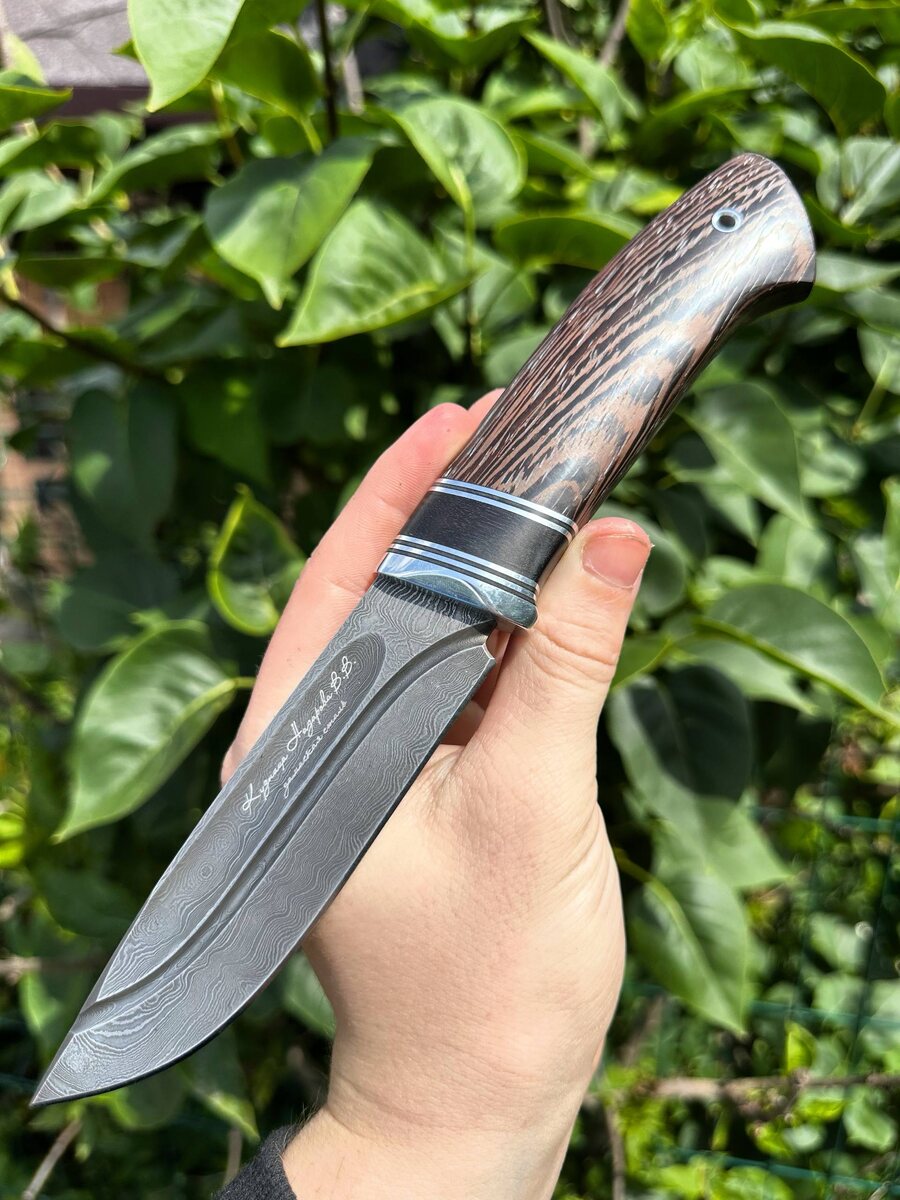 Готовы два удобных охотничьих ножа «Странник» из дамасской стали в 950 слоев с фигурными долами на клинке