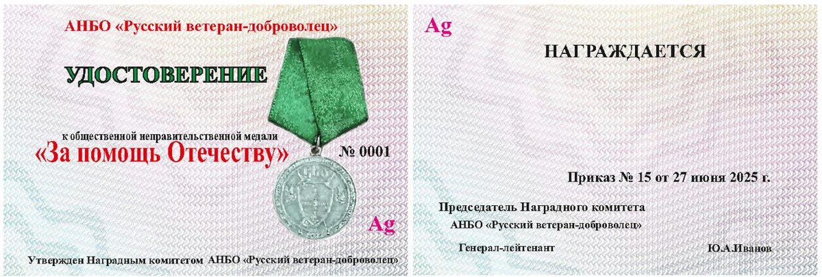 Удостоверение к серебрянной медали «За помощь Отечеству» наградной комитет АНБО «РУССКИЙ ВЕТЕРАН-ДОБРОВОЛЕЦ»