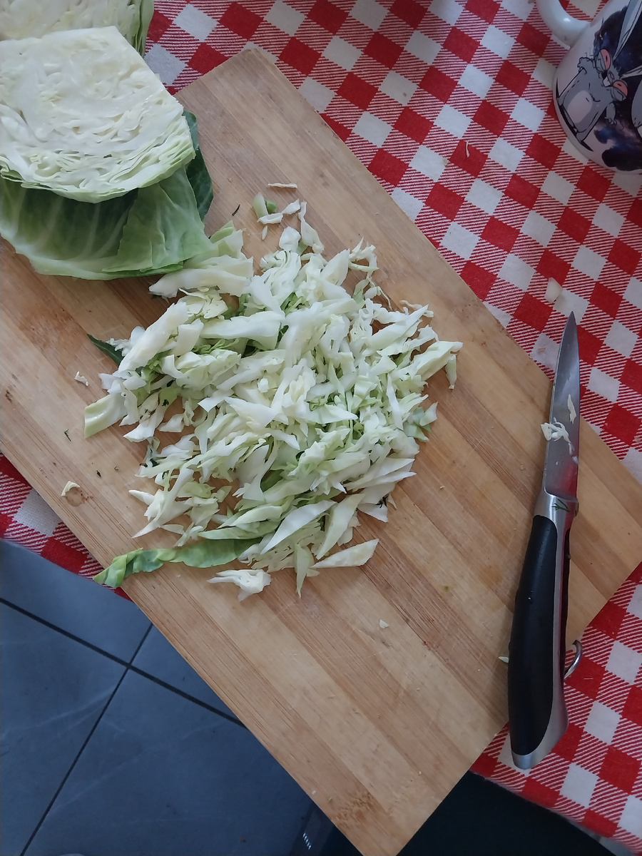 В магазине появилась свежая недорогая с нежными,тонкими листочками зеленая капуста.Айда делать салатик. Шинкую мелко капусту,благо листики нежные Добавляю морковку тертую на мелкой терке Все жамкаю,что выделилась водичка. Нарезаю розовые помидорки и огурец Добавляю кинзу И вишенка на " торте")) - заправляем рапсовое масло и выжать лимон,посолить Ммм😋,очень вкусно и полезно))