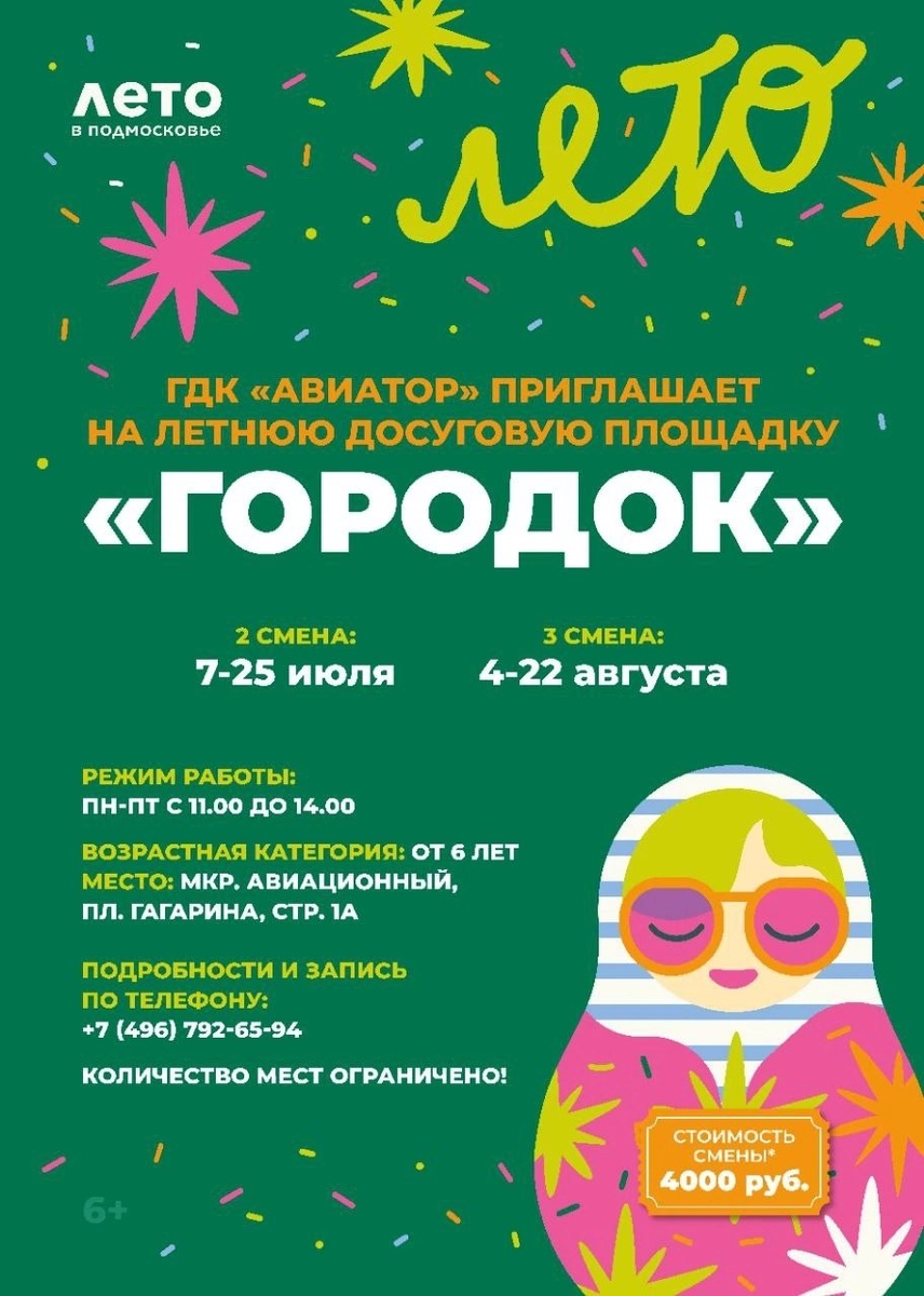✨ Лето зовет в «ГОРОДОК»! ☀ Открыта запись на летнюю досуговую площадку! Забудьте о скуке! Мы подготовили насыщенную программу, полную веселья и новых открытий для детей от 6 лет. В программе: 🔸Яркие мастер-классы 🔸Захватывающие квесты 🔸Активные спортивные игры 🔸Познавательные и развлекательные мероприятия 🔸Прогулки и игры на свежем воздухе! Каждая смена – это уникальное приключение! Смены: понедельник-пятница 2 смена - с 7 по 25 июля (11:00-14:00) 3 смена - с 4 по 22 августа (11:00-14:00) По всем вопросам обращайтесь по телефону: 8 (496) 792 65 94 🚫 Возраст: 6+ 🏢 Городской дом культуры «Авиатор» 📍 г. Домодедово, ул.Гагарина, д.1 💰 Цена: 4000 ₽ ✅ Мероприятия Домодедово https://dzen.ru/id/66f10385cc4c5a16f7b5fb02 http://vk.com/domodedovo_events http://dzen.ru/domodedovo_events