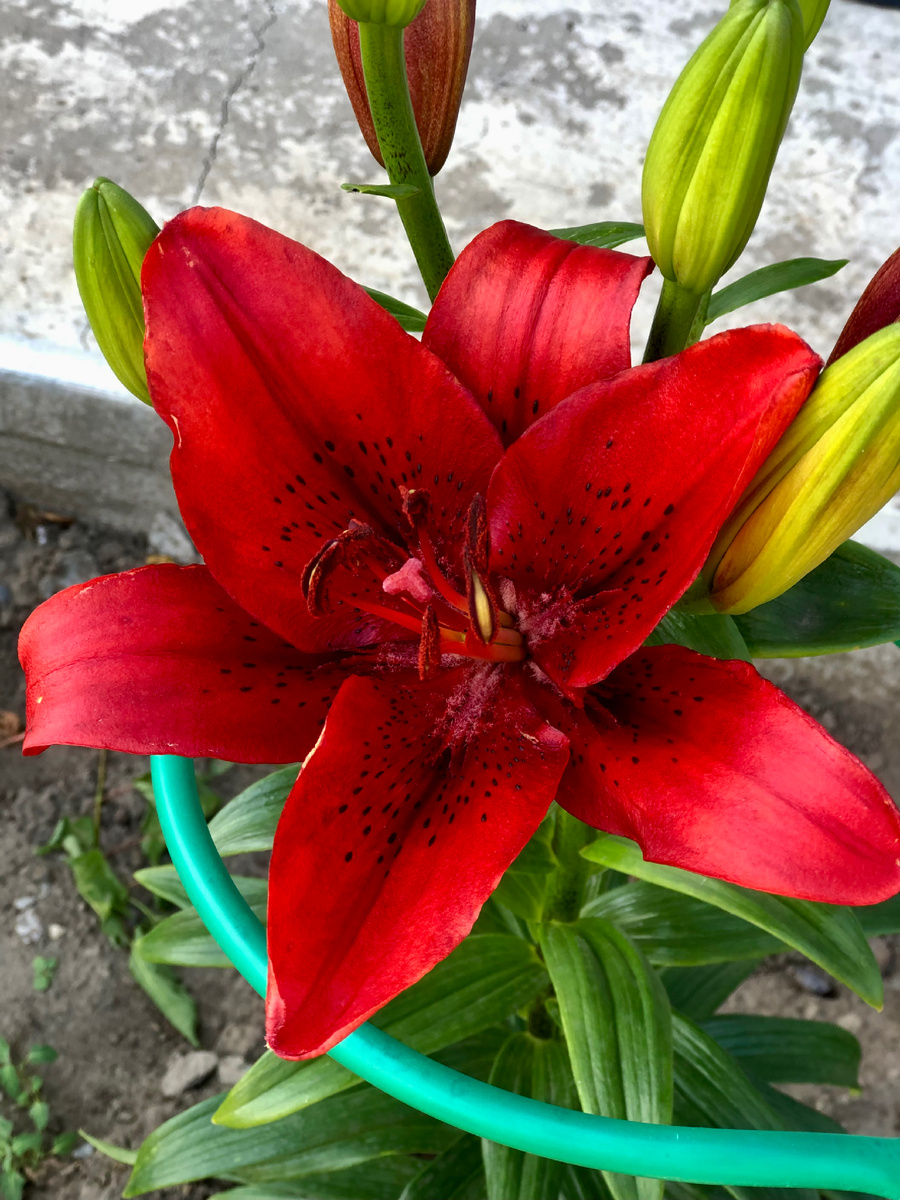 Сегодня 29 июня 2025 года, солнечный денек, воскресенье. Рано утром, в шестом часу, я выхожу выгуливать котов. И вот сегодня мы с Касиком и Кубиком заметили воскресный сюрприз-первую в этом году лилию! Прошлым летом и осенью мы посадили много разноцветных лилий, покупали их где только попадались. Понравилась? Берем! Теперь лилии у нас соседствуют с розами. Розы давно цветут, а вот лилии только набирали силы. Розы на сегодняшний день выглядят так: Двор украшают кашпо с петуниями. На газонах растут голубые елочки, все перезимовали отлично. Ягода в этом году: земклуника не впечатлила, будем менять на обычную клубнику. Смородина: красная, черная, белая - понемногу. Две горстки жимолости созрело. Крыжовника нет, растет и пока крепнет. Вишни тоже будет горстка, ещё маленькая, как и малина. Ежевика цветет. Огурцы срывали уже, штук 5, начинается огуречный бум. Помидоры ещё незрелые. Перцы, баклажаны красивые, перцы уже ели. В этом году сделали пока два важных дела-поставили хозблок, декоратив