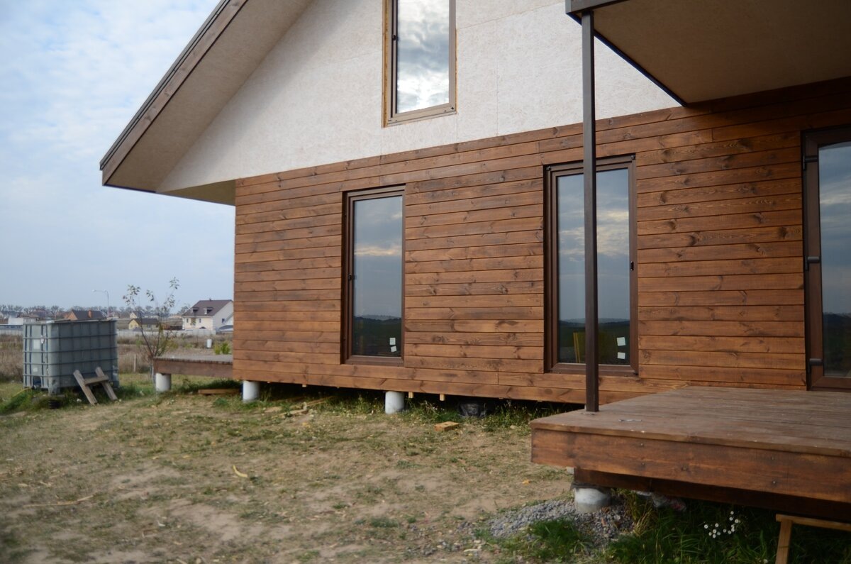 Все чаще можно увидеть проекты частных жилых домов, фасад которых частично или полностью облицован деревянными рейками, закрепленными с небольшим зазором относительно друг друга.