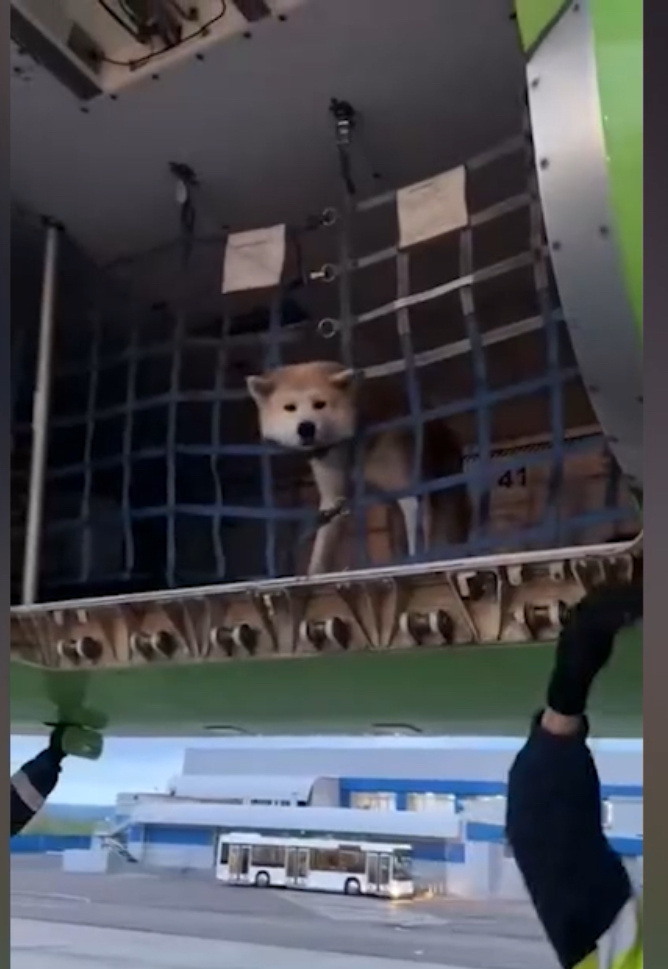 Акита сломала переноску и сбежала в самолёте. Она, что дикая.