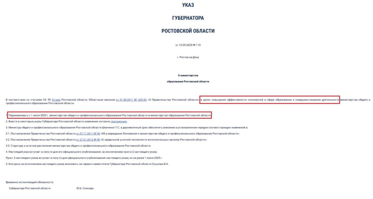 Меньше букв — меньше ошибок: в Ростовской области сократили название министерства Коллеги из издания 1рнд заметили любопытное нововведение. Врио губернатора Юрий Слюсарь подписал указ о переименовании областного Министерства общего и профессионального образования. Теперь оно будет называться просто Министерством образования. От длинного названия решили избавиться не для экономии бумаги. По мнению Слюсаря, короткое имя повысит эффективность полномочий в сфере образования и усовершенствует деятельность ведомства. Внимательные пользователи предположили: возможно, дело в недавнем конфузе министра просвещения России Сергея Кравцова, который в "Артеке" подписал фотографию фразой "с празником", пропустив букву "д". Есть версия, что название сократили из практических соображений: чем меньше букв, тем меньше шансов на грамматические ошибки. Логично! Изменения вступают в силу с 1 июля. Правда, как именно короткое название повысит эффективность работы министерства, в документе не объясняется