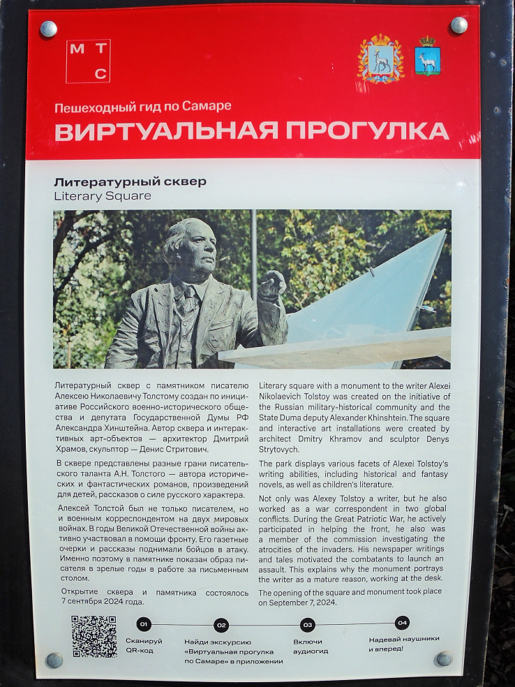 В сентябре 2024 года в Самаре был открыт памятник Алексею Толстому. Установили его рядом с усадьбой, в которой прошла часть детства будущего писателя. Вокруг памятника устроен целый сквер, наполненный отсылками к его творчеству. Подробно сквер я уже показывал, ссылку на первый обзор можно найти в конце статьи. Первое моё знакомство с новым местом было в октябре, поэтому хотелось посмотреть на него летом. В начале июня текущего года снова побывал там. Предлагаю вновь пройтись уже по летнему скверу. Смысловое наполнение дублировать не буду, если кому-то интересно, можно прочитать обо всём в предыдущей статье. Краткое описание приводится на информационной табличке. Осенью её либо не было, либо я не заметил. Условная входная группа. Вид на памятник от неё. Столик с «лампой». Элементы оформления сквера. Цветов и зелени пока довольно мало. Со временем, наверное, всё подрастёт. Памятник поближе. Азбука у Мальвины интерактивная. Кнопки, буквы на которых складываются в имя Буратино, нажимаются.