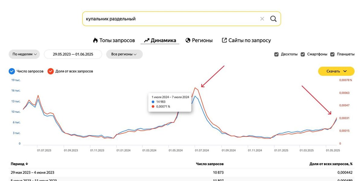 ❔ Спрос на купальники создают сами селлеры Ситуацию, друзья: 1. По Wordstat падание. Это логично, трафик перетекает на площадки типа WB и нейронки. А может, и лето еще не наступило по мнению покупаетелей. 2. Трафик на WB тоже в просадке в сравнении с прошлым годом. Покупаетели еще не начали (а может уже и не начнут) нуждаться и запрашивать купальники. Тренд уже вниз (см. скрины) 3. А вот продажи в категории выше, чем в прошлом сезоне по всем сервисам аналитики. Вопросик возникает, как так? 🔘Может системы аналитики криво парсят? 🔘Может все селлеры поголовно решили покупать трафик на чужой бизнес и просто ведут внешку на ВБ, это и ведет к падению спроса внутри платформ, но продажи остаются? Причем, спрос создают сами селлеры через внешку: Лето же пришло — иди покупай купальник и без разницы, что на улице холод)