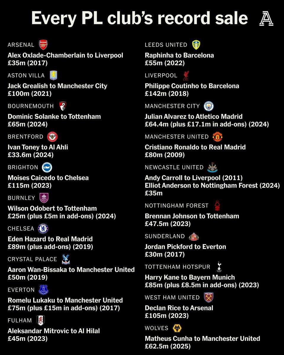 Рекордная продажа каждого клуба Премьер-Лиги 💰