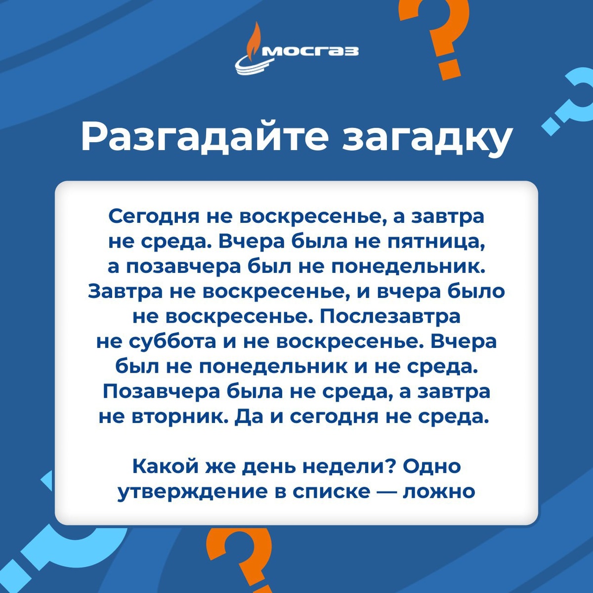 Выходные — это идеальный момент для решения наших задачек! И вот новая уже ждет вас. Выбирайте правильный ответ с помощью реакции: ❤️ — суббота 👍 — понедельник 😍 — пятница 😎 — воскресенье @aomosgaz