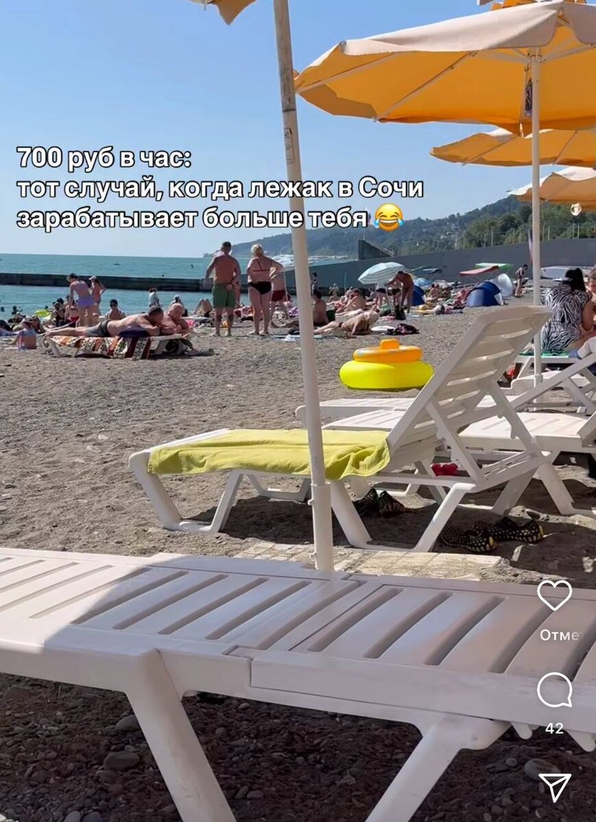 В Сочи местные предприниматели сдают пляжные лежаки по цене около 700 рублей в час При средней загрузке лежака в 8 часов в день и работе всё лето на первой линии это приносит хозяину порядка 168 тысяч рублей в месяц.