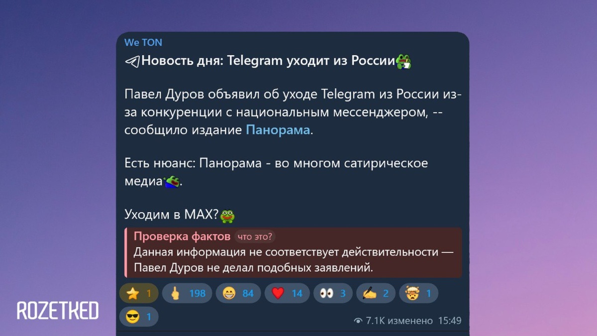 Telegram решил дать бой фейковым новостям? По новостным каналам распространилась новость об уходе мессенджера из России. Источником выступило сатирическое издание «Панорама». Издание «Код Дурова» обратило внимание, что Telegram решил опровергнуть это необычным способом и ко всем постам с этой новостью была добавлена плашка с опровержением. Будет ли распространяться этот метод фактчекинга на другие новости, и если да, то на какие именно — пока не известно. 💼 Rozetked | Подписаться