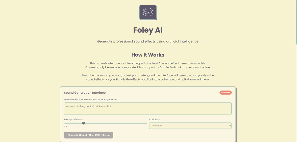 Foley AI — это передовая платформа, предназначенная для автоматической генерации высококачественных звуковых эффектов, синхронизированных с видеоконтентом. Используя передовые алгоритмы искусственного интеллекта, она позволяет создавать реалистичные звуковые дорожки, соответствующие визуальным событиям в видео.