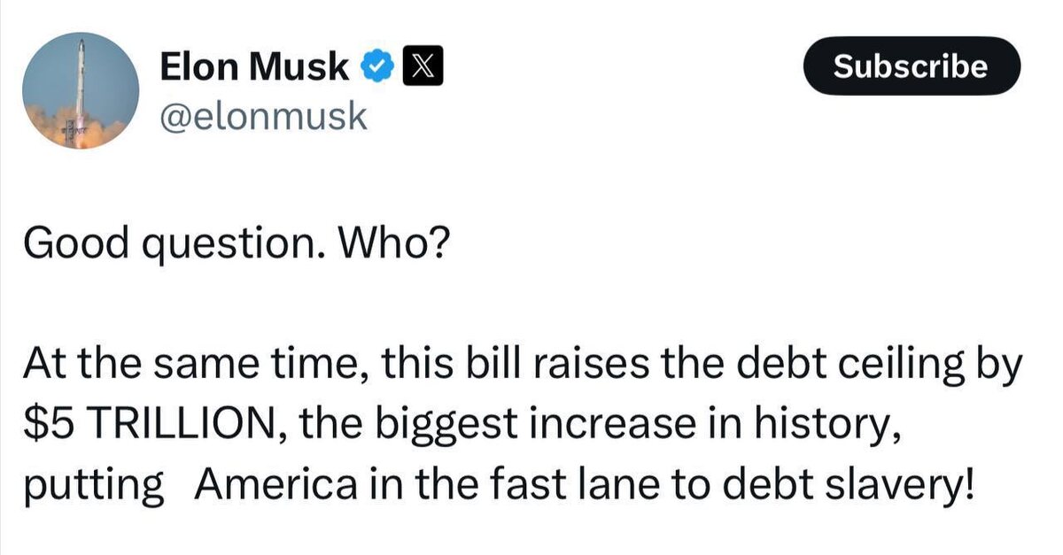 Законопроект Трампа ведет США к долговому рабству, заявил Илон Маск. Инициатива, по его словам, увеличит порог госдолга США на рекордные $5 трлн. «Этот законопроект увеличит потолок госдолга на $5 трлн, это самое большое увеличение в истории, которое направит Америку по кратчайшему пути к долговому рабству» Как утверждает американский бизнесмен, законопроект также «уничтожит миллионы рабочих мест в Америке» и нанесет огромный стратегический вред США.