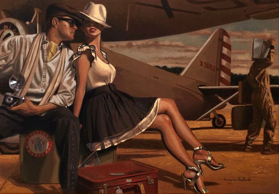 Представьте мир, где «Титаник» не пошел ко дну, «Гинденбург» не сгорел в небе, а сын Линдберга никогда не исчезал. Мир, лишенный травм XX века, но сохранивший его эстетику — яркую, томную, полную скрытых опасностей. Именно такой альтернативной реальностью дышат полотна британского художника Перегрина Хиткота, чье творчество стало мостом между прошлым и настоящим, между нуаром и современным осмыслением человеческой природы. Хиткот не просто воссоздает ретро-стилистику — он переписывает историю, предлагая зрителю мир, где трагедии остались за кадром, но их тень все равно витает в воздухе. Его работы — это не слепое подражание винтажной эстетике, а ее переосмысление через призму «солярного нуара». Термин, введенный критиками после выхода «Леди из Шанхая» Орсона Уэллса, здесь обретает новое звучание: солнце на картинах Хиткота не освещает, а скорее подсвечивает тревогу. Оно садится, окрашивая небо в карамельные тона, но за этим великолепием уже клубятся грозовые тучи. Такой подход превращ