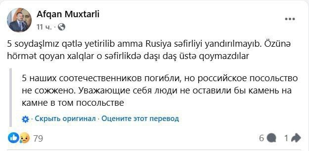 В Азербайджане звучат радикальные призывы после сообщений о гибели граждан в России Азербайджанский журналист и активист Афган Мухтарлы заявил, что посольство России в Баку должно быть сожжено. По его словам, «нации, уважающие себя, не оставили бы камня на камне от этого посольства». Судьбу хохлов захотели 🌟 Мазков. Подписаться