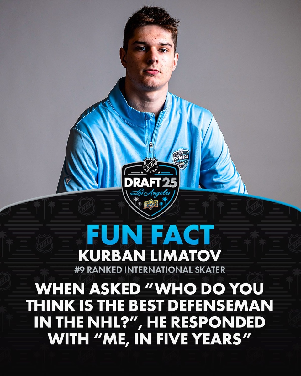 🇷🇺 Российские новости с драфта новичков НХЛ На завершившемся драфте был выбран 21 россиянин. «Каролина» традиционно много берёт российских игроков: 2-й раунд: Иван Рябкин, форвард (62-й пик), Семён Фролов, вратарь (41-й пик). 3-й раунд: Роман Баусов, защитник (87-й пик), Курбан Лиматов, защитник (67-й пик). Лиматов, кстати, отвечая до драфта на вопрос о том, кого он видит лучшим защитником НХЛ, отвечал, что это он лет через пять — что ж, посмотрим. Самым возрастным российским игроком с этого драфта стал 20-летний вратарь Илья Канарский, выбранный в 7-м раунде под общим 194-м номером «Чикаго». Егор Мидлак, тоже вратарь, стал последним игроком, выбранном на драфте — общий 224-й номер, «Флорида». В целом по цифрам примерно стандартный драфт для российского хоккея, но непривычно видеть в первом раунде лишь одного представителя РФ. В 2024-м году в первом раунде было четверо россиян. В 2023-м тоже четверо. В 2022-м трое. В 2021-м один Фёдор Свечков. В 2020-м четверо. Так что непривыч